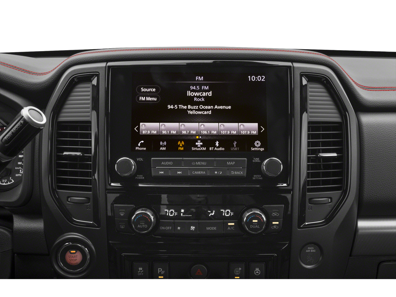 - Radio: NissanConnect w/Navigation -inc: 9" touchscreen display, 6 speakers, wireless Apple CarPlay, Android Auto, SiriusXM radio, Nissan door to door navigation w/3D building graphics and satellite imagery, connected navigation features including online POI search, over-the-air map updates and online premium traffic information, SiriusXM Traffic, SiriusXM Travel Link w/weather, fuel prices, movie listings, stock info, sports and parking, TomTom weather, Wi-Fi hotspot, follow me home function, 2 illuminated USB connections (1 type A, 1 type C), 2 USB-A charge only ports, Bluetooth® hands-free phone system, streaming audio via Bluetooth® and hands-free text messaging assistant